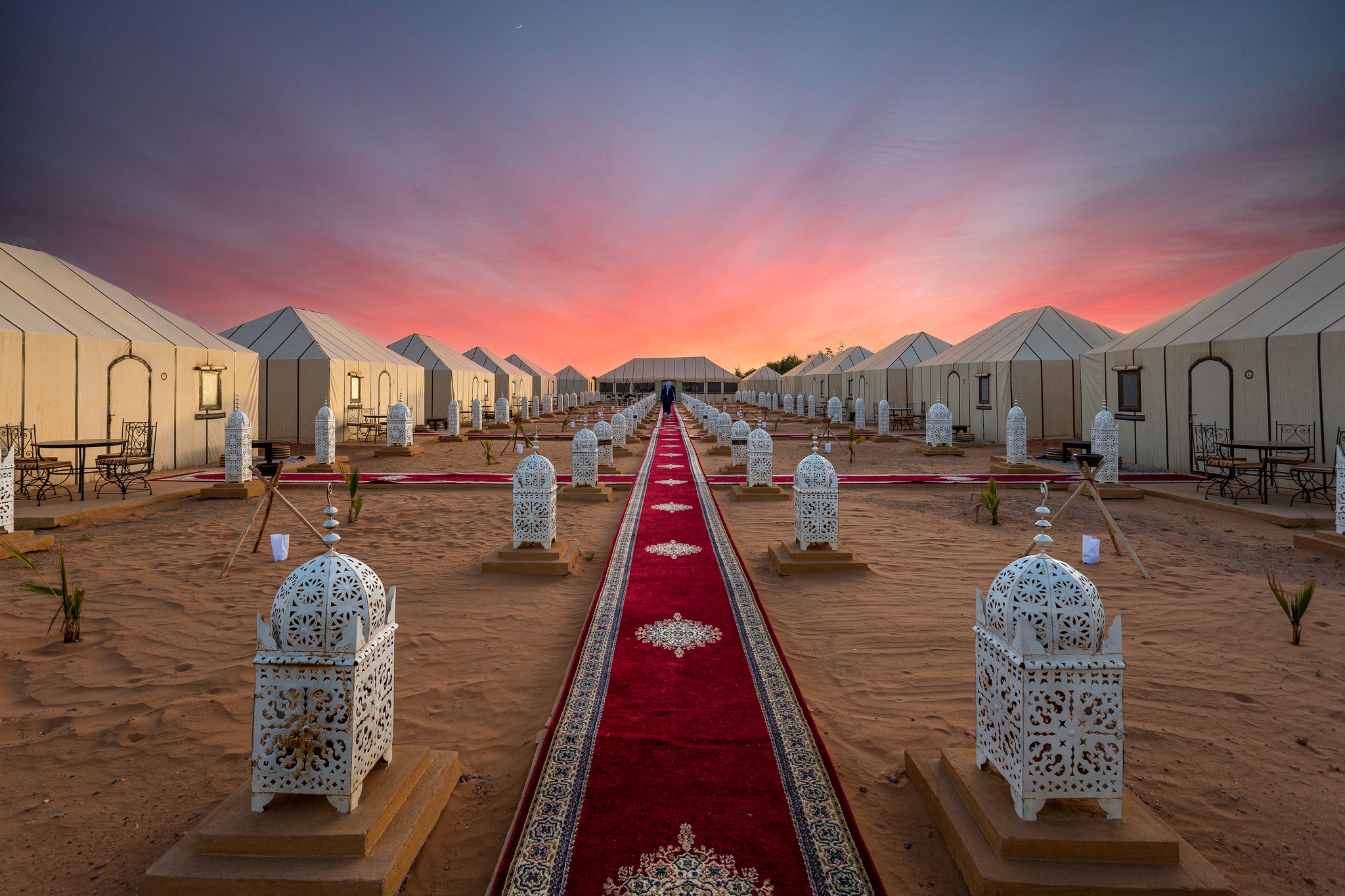 Después de fotografiar el amanecer y desayunar, regresará al pueblo de Merzouga a lomos de un dromedario. En ruta, admirará la belleza única de las imponentes dunas de Erg Chebbi, que cambian de día en día. Tras llegar a Merzouga a última hora de la mañana y ducharse en el hotel, continuará hacia Rissani, la antigua Sijilmassa, lugar de fundación de la dinastía alauí, la actual familia gobernante. La mayoría de las mujeres llevan velo y los hombres capucha, una ciudad marroquí muy tradicional. Continuación hacia Agdez, pasando por Alnif y Tazarin, almuerzo en N’kouba antes de llegar al fascinante valle del Draa, al borde de la cordillera del Atlas, y continuación hacia Ouarzazate. Alojamiento en un riad.