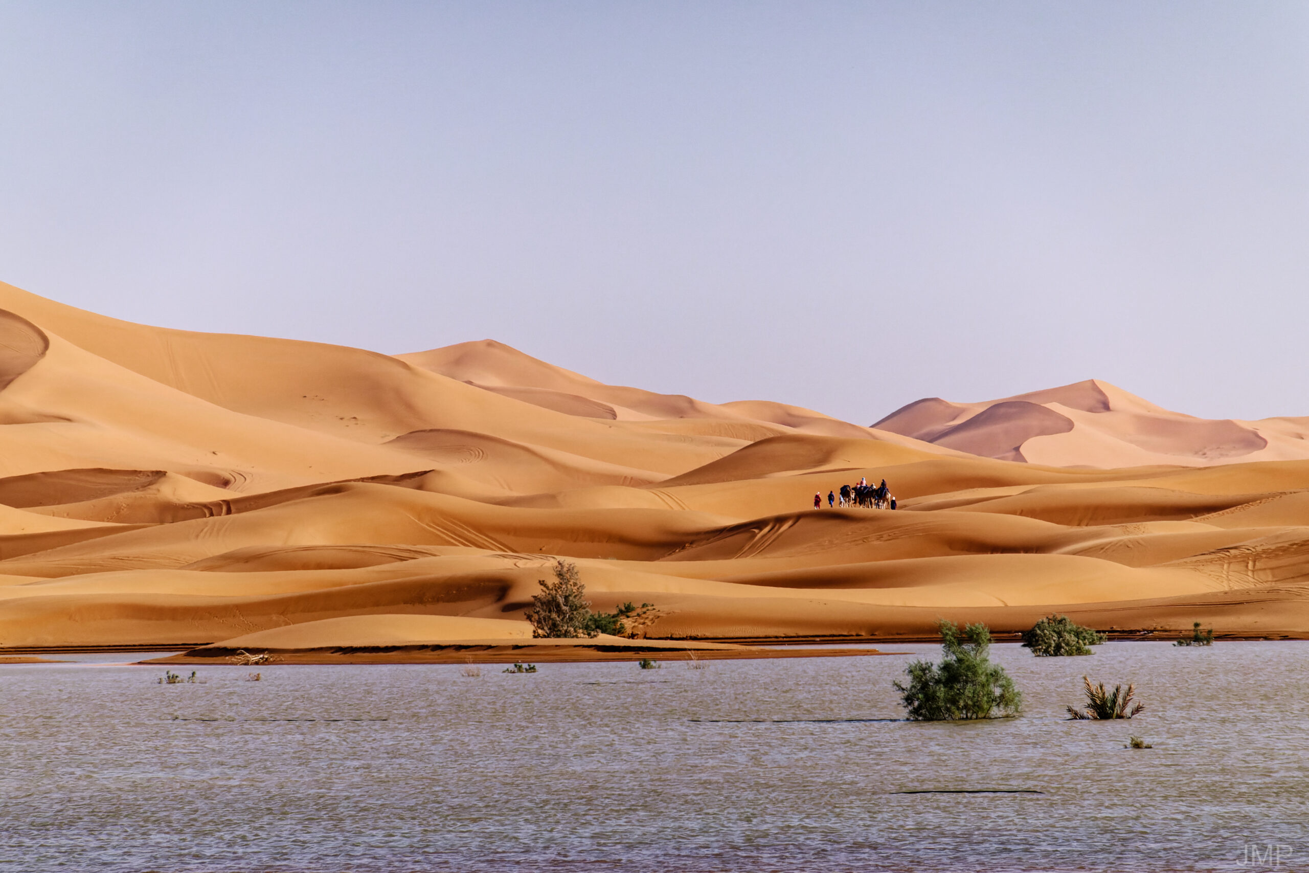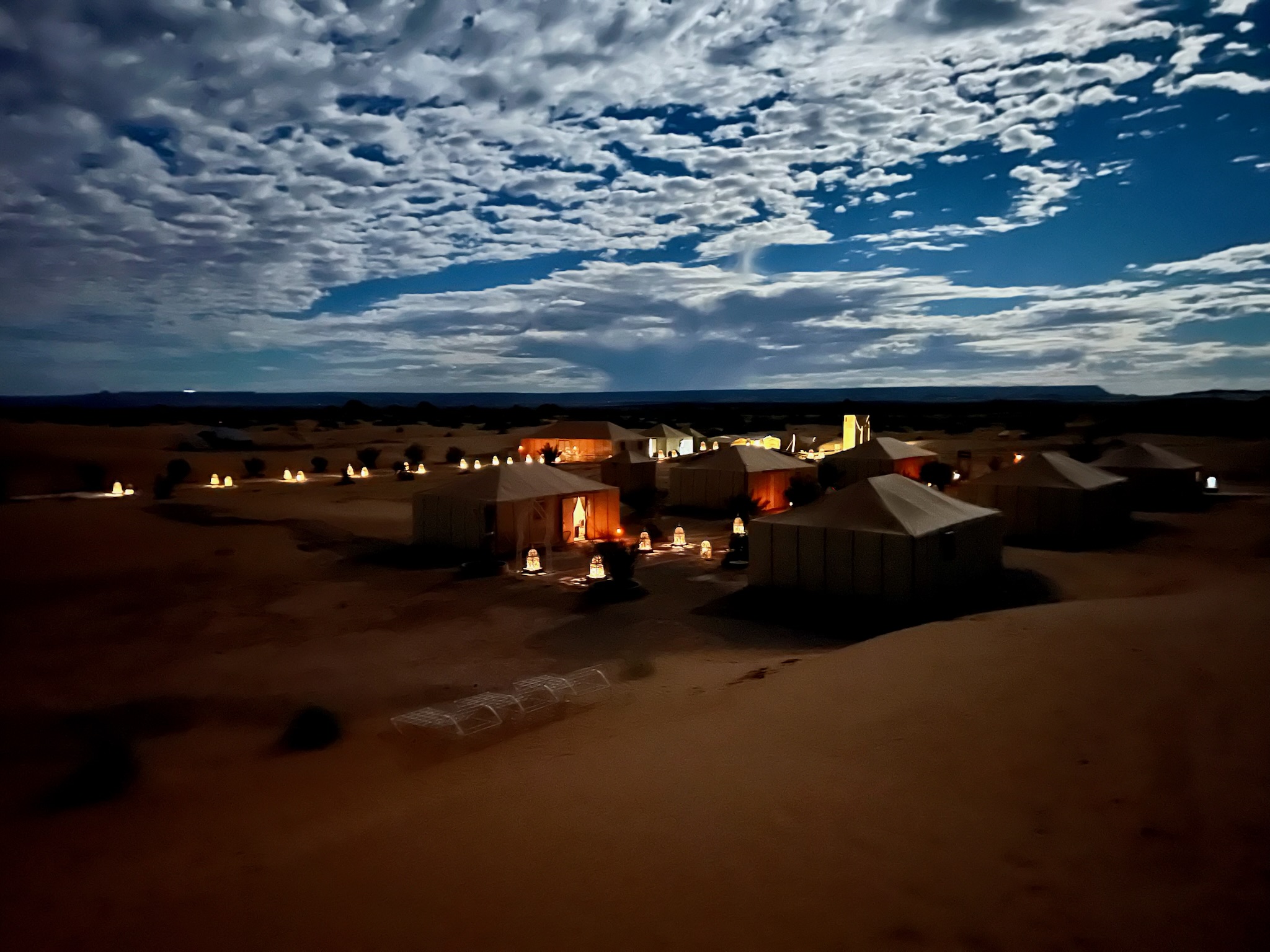 Esta será una etapa donde después de desayunar, recorremos otra de las pistas que utilizaban en el “Rally París-Dakar”, visitando nómadas del desierto con los que tomaremos el té y veremos el oasis donde se rodaron algunas películas como “Sáhara”, protagonizada por Penélope Cruz. Visitaremos el poblado de “los negros”, llamado así por el comercio de esclavos que traían del Sudán. Y después de comer cambiaremos la tracción del 4×4 por la de la tracción animal. Los dromedarios nos adentrarán al desierto de dunas para poder contemplar una puesta de Sol inolvidable. Esta noche será especial, dormiremos en las dunas en tiendas nómadas (Jaimas), como lo hacen los Bereberes. Aquí disfrutaremos de una cena Bereber, música y un cielo estrellado como no has visto nunca. Cena y alojamiento en la inolvidable Jaima.